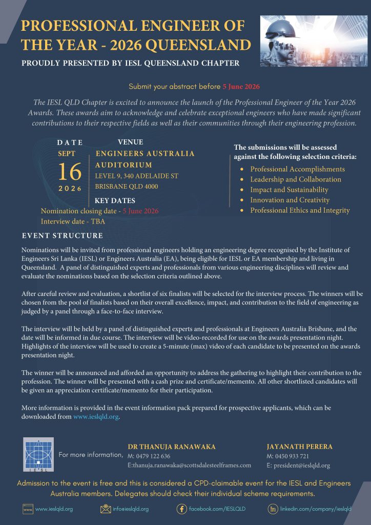 Nominations will be invited from professional engineers holding an engineering degree recognised by the Institute of Engineers Sri Lanka (IESL) or Engineers Australia (EA), being eligible for IESL or EA membership and living in Queensland. A panel of distinguished experts and professionals from various engineering disciplines will review and evaluate the nominations based on the selection criteria outlined above.
